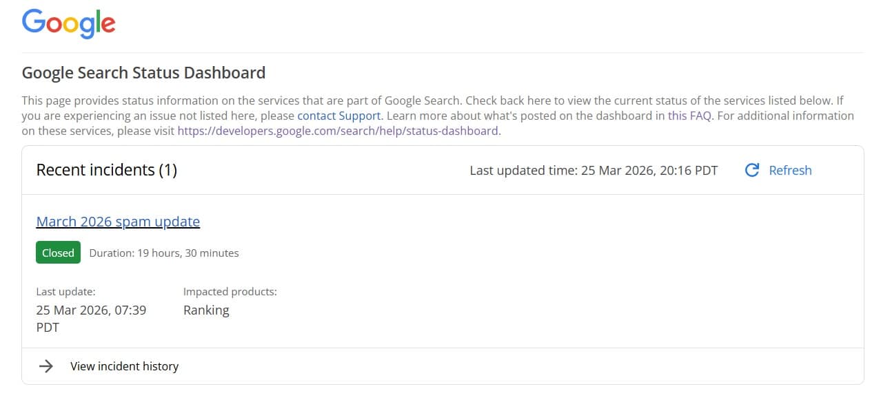 Theo bảng điều khiển trạng thái tìm kiếm của Google, Google đã hoàn tất bản cập nhật chống spam tháng 3 năm 2026 sau khi triển khai chỉ trong vòng chưa đầy 20 giờ.