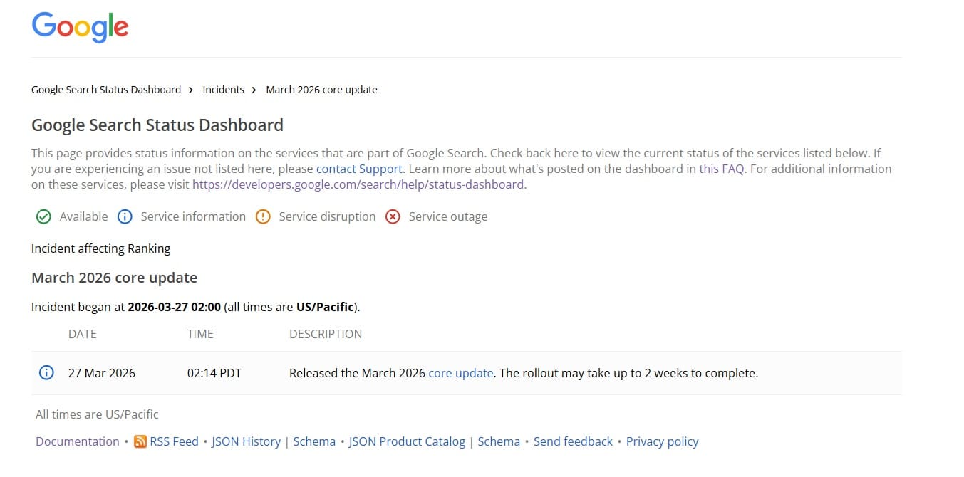 Theo thông báo trên Bảng điều khiển trạng thái tìm kiếm của Google, Google đã bắt đầu triển khai bản cập nhật cốt lõi tháng 3 năm 2026. Google cho biết bản cập nhật bắt đầu lúc 2:00 sáng giờ Thái Bình Dương ngày 27 tháng 3 và có thể mất đến hai tuần để hoàn tất.
